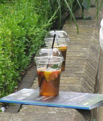 Un bicchiere di Pimm's, il cocktail tipico dei Championships, a base di champagne e frutta. Insieme alle fragole con crema è il vero must di ogni spettatore -