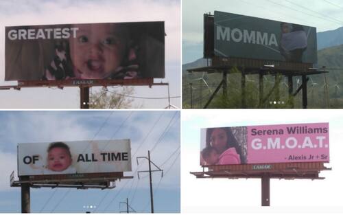 I primi tre manifesti compongono la frase Greatest Momma of All Time, ossia “La più grande mamma di tutti i tempi”. Il quarto recita: “Serena Williams: G.M.O.A.T. Alexis Jr. + Sr.”-