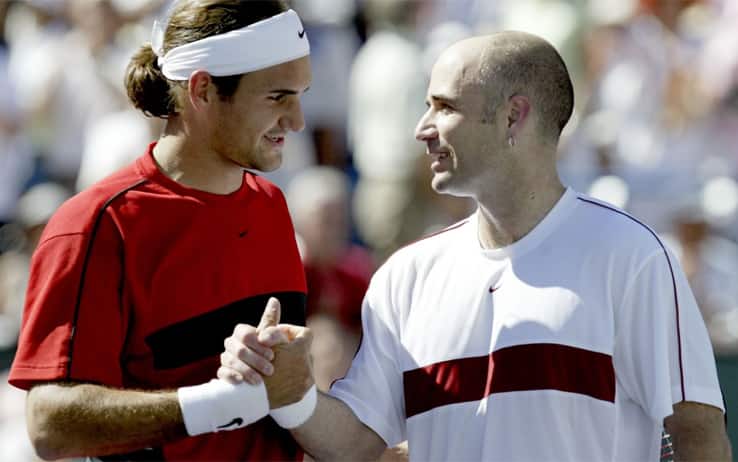 Roger Federer e Andre Agassi in semifinale a Indian Wells 2004 (Getty)