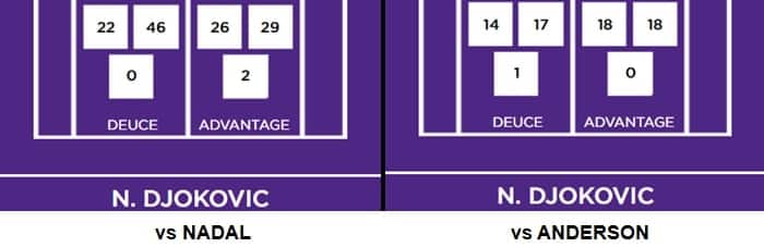 Nella partita di ieri Djokovic ha effettuato tre aggiustamenti principali rispetto alla sfida contro Nadal, conclusa meno di 24 ore prima, che di conseguenza sono stati preparati in pochissimo tempo. Innanzitutto fin dal primo game si è visto come Djokovic abbia spesso e volentieri utilizzato il back per spezzare il ritmo e far piegare un giocatore alto più di 2 metri come Anderson. A un certo punto una grafica suggeriva che il rovescio in top di Djokovic aveva un’altezza media di poco più di un metro – quindi a livello del bacino di Anderson, in condizioni ideali di impatto – mentre il rovescio tagliato veleggiava a poco più di 50 centimetri da terra dopo il rimbalzo, costringendo quindi Anderson a colpire la palla praticamente a livello delle ginocchia. Rispetto alla semifinale contro Nadal, Djokovic a inizio secondo set stava giocando in back quasi la metà dei colpi di rovescio (45%) mentre contro lo spagnolo avveniva solo nel 7% dei casi, principalmente per recuperi in allungo di emergenza.