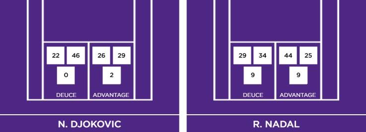 Queste sono invece le statistiche finali sulle prime di servizio in campo. Nadal ha finito col servire più volte sul rovescio di Djokovic da destra e più volte sul dritto da sinistra, forse cercando più punti diretti da ambo i lati grazie al servizio centrale. Nadal ha anche deciso di servire 18 volte al corpo di Djokovic, contro le sole 2 del serbo.
