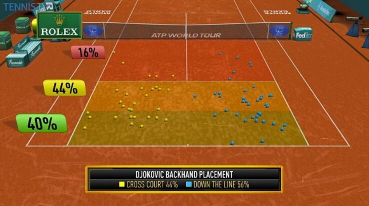 L'anticipo e la tecnica sul rovescio hanno permesso a Djokovic di riuscire spesso in carriera a tagliare le gambe a Nadal nello scambio, anche giocando i rovesci lungolinea. Come si vede nella grafica sotto, che si riferisce alla semifinale di Montecarlo 2015, Djokovic riusciva a effettuare efficaci lungolinea anche sulla terra, dove c'è più rischio che un lungolinea corto o debole schizzi di meno e sia più attaccabile in diagonale dall'avversario. Djokovic dovrà essere più preciso che in passato a giocare i rovesci lungolinea: Nadal riesce ora a tagliare molto meglio il campo e a ribaltare l'inerzia dello scambio giocando a sua volta il rovescio anticipato dalla parte destra.