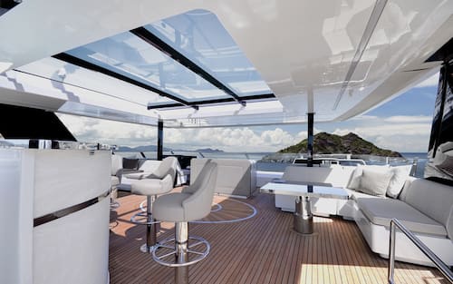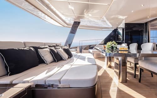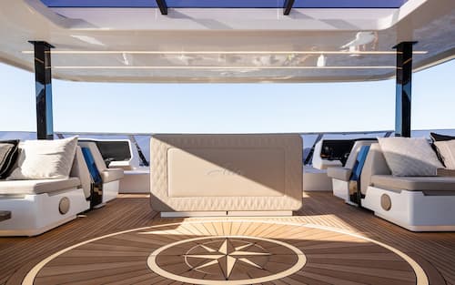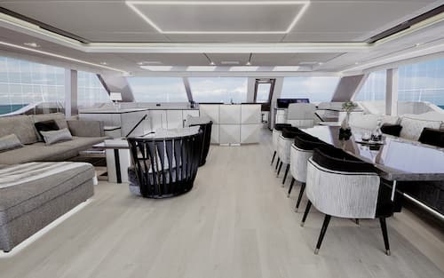 Il salone principale si apre sull'ampio pozzetto di poppa per combinare lo spazio da pranzo interno dello yacht con le aree relax all'aperto, dove sono disponibili più posti a sedere con un mobile bar (foto dal sito Sunreef Yachts).