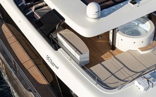 Il Sunreef 80 Power incorpora oblò classici in acciaio inossidabile, ponti con suola in teak, alti baluardi e illuminazione d'atmosfera sottile. Il suo enorme garage combinato con una piattaforma di poppa permette di portare il suo gommone e moto d'acqua ovunque vada (foto dal sito Sunreef Yachts).
