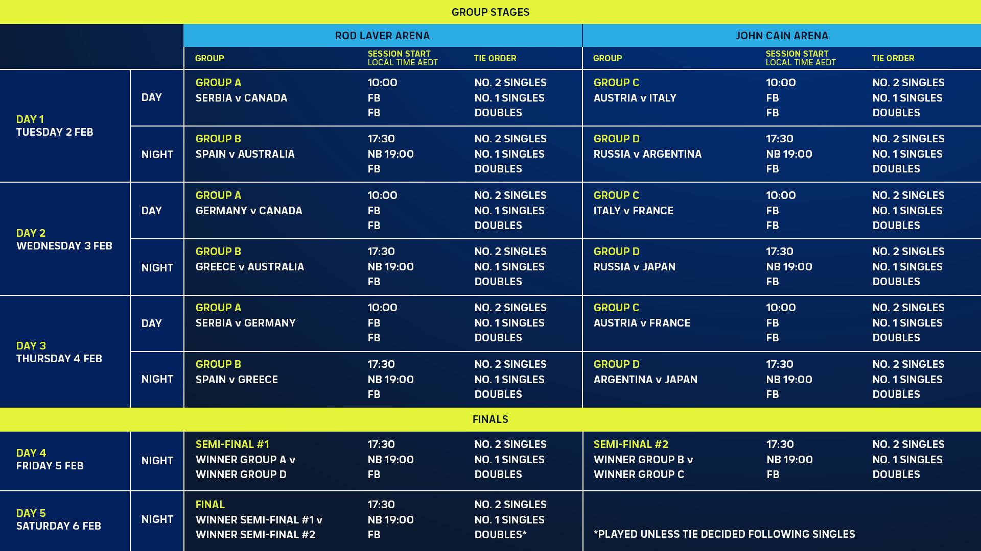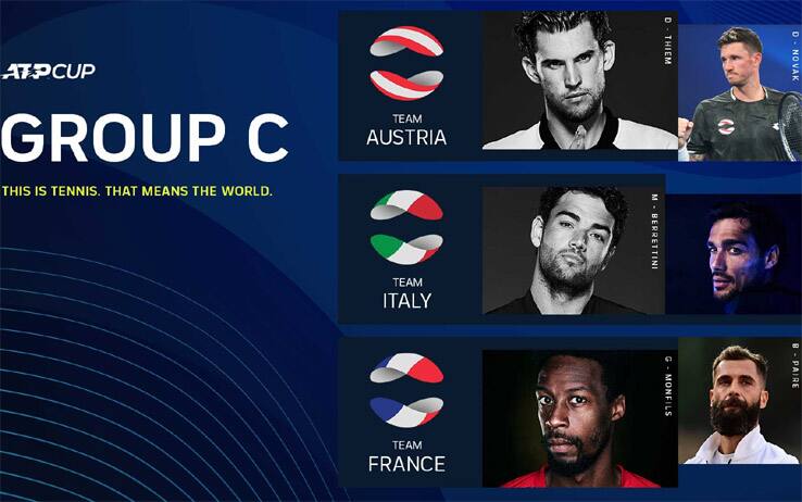 In campo nella prima giornata l'Italia contro l'Austria di Thiem e Novak. La squadra azzurra tornerà poi in campo nella seconda giornata, sempre in sessione diurna contro la Francia di Gael Monfils e Benoit Paire. Definiti anche gli accoppiamenti delle semifinali, a cui accedono le prime classificate dei quattro gironi. L'Italia è nel gruppo C. Chi dovesse vincerlo incontrerà la vincente del gruppo B, quindi una tra Spagna, Australia e Grecia. Le semifinali si giocheranno in contemporanea, venerdì 5 febbraio, dalle 7.30 ora italiana. Alla stessa ora, il 6 febbraio, è in programma la finale della ATP Cup 2021. I match in diretta su SuperTennis, canale Sky 224.