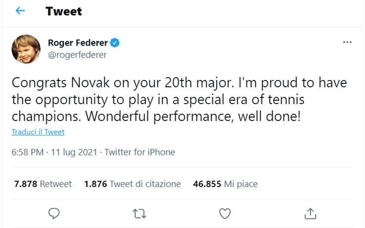 "Congratulazioni a Novak per il suo ventesimo Slam. Sono orgoglioso di avere l'opportunità di giocare in un'era speciale di campioni di tennis. Splendida esibizione, bravo!"