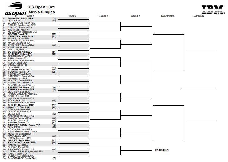 Jannik Sinner, n.16 ATP e 13esimo favorito del seeding, inizierà il suo cammino affrontando l’australiano Max Purcell, n.191 ATP, in gara con una wild card. Il 20enne altoatesino di Sesto Pusteria, che alla sua terza partecipazione al tabellone principale insegue il primo successo, è nella parte alta del tabellone, con probabile incrocio al terzo turno con il francese Gael Monfils, 17esima testa di serie, e nel caso l’azzurro dovesse proseguire il cammino ipotetico ottavo di finale con Alexander Zverev, quarta forza del torneo. Lorenzo Sonego, n.23 del ranking e 20esima testa di serie, troverà dall’altra parte della rete il tedesco Oscar Otte, n.144 ATP, proveniente dalle qualificazioni. Fabio Fognini, n.31 del ranking e 28 del seeding, debutta con il canadese Vasek Pospisil, n.58 ATP, alla decima apparizione in questo torneo, dove lo scorso anno si è spinto fino agli ottavi.