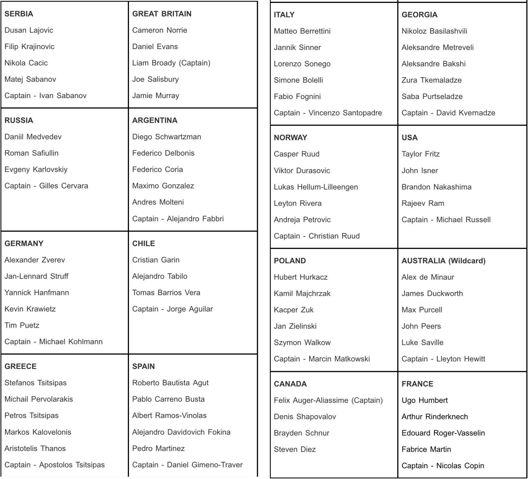 L’avversaria più insidiosa per gli azzurri verrà sicuramente dal Gruppo C, il più tosto, che comprende la Germania di Alexander Zverev e Struff (con un doppio molto solido), il Canada di Auger-Aliassime e Shapovalov (in dubbio dopo la positività al Covid), la Gran Bretagna con Norrie e Evans (e un signor doppio) e gli Stati Uniti con Taylor Fritz, John Isner, Brandon Nakashima e il doppista Ram. Molto meno “pericolosi” sembrerebbero i team che potrebbero emergere dal Gruppo A dove è favorita la Spagna con Carreno Busta e Bautista Agut, su Serbia (senza Nole), Norvegia (Ruud non ha compagni di livello) e Cile. Lo stesso dicasi per il Gruppo D, presidiato dalla Grecia di Tsitsipas (anche lui solo) che deve vedersela con l’Argentina di Schwartzman, la Polonia di Hurkacz e la Georgia di Basilashvili.