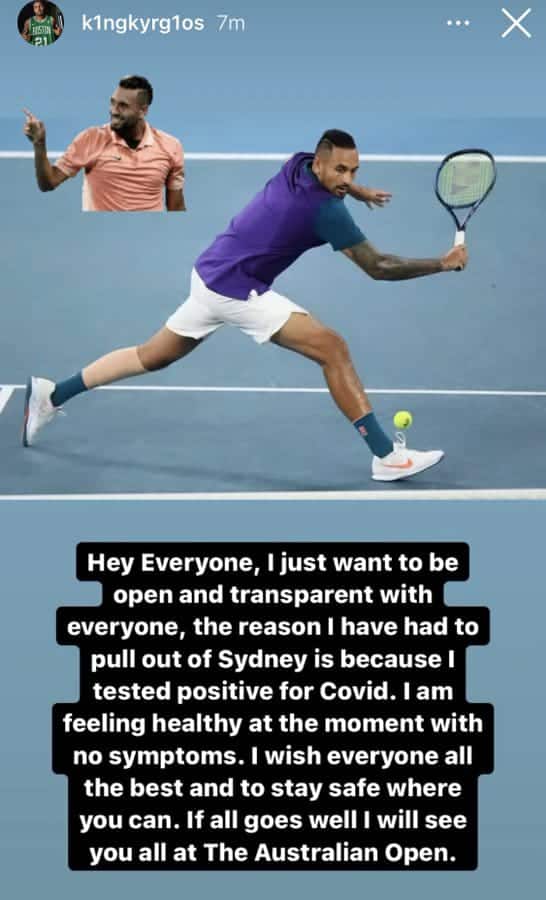 Nick Kyrgios è risultato positivo al Covid-19. Ad annunciarlo è stato lo stesso tennista australiano sui social, dopo che era stato ufficializzato il suo ritiro dal torneo 250 di Sydney, in cui avrebbe dovuto incontrare al 1° turno Fabio Fognini. Al suo posto ha giocato il tedesco Daniel Altmaier, sconfitto in due set dal ligure.