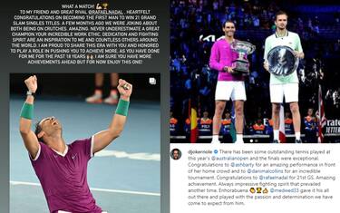 Arrivano le congratulazioni di tanti campioni dello sport per l'impresa di Nadal a Melbourne, a cominciare da quelli degli due fenomeni che lo spagnolo ha appena superato come numero di Slam vinti (Rafa è il primo in assoluto nella storia ad arrivare a 21). Ma i due messaggi, entrambi postati sui propri profili social, sembrano decisamente diversi...
