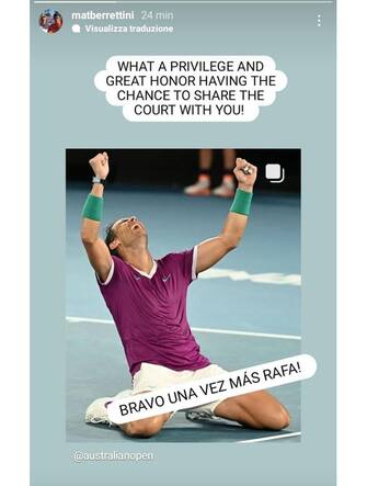 MATTEO BERRETTINI. "Che privilegio e che onore avere l'opportunità di condivire il campo con te! Ancora una volta, bravo Rafa!".