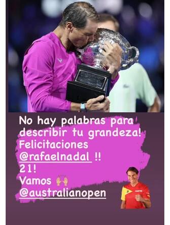 ROGER FEDERER. "Che partita! Grande amico e rivale, congratulazioni di cuore per essere diventato il primo a vincere 21 titoli del Grande Slam nel singolare. Qualche mese scherzavamo per essere entrambi sulle stampelle... Mai sottovalutare un grande campione. La tua incredibile etica del lavoro, la dedizione e il tuo spirito di lotta sono un'ispirazione per me e gli altri in tutto il mondo. Sono orgoglioso di condividere questa 'era' con te e onorato di aver contribuito a spingerti per raggiungere i tuoi successi e quelli che verranno. Ma ora goditi questo!".