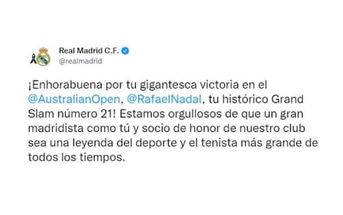REAL MADRID. "Congratulazioni per la tua gigantesca vittoria agli Australian Open e per il tuo storico 21° Grande Slam! Siamo orgogliosi che un grande madridista come te e un membro onorario del nostro club sia una leggenda dello sport e il più grande tennista di tutti i tempi".
