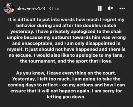 In una storia su Instagram, il tennista tedesco si è scusato per il gesto compiuto: "E' difficile esprimere a parole quanto io sia pentito del mio comportamento durante e dopo il match di doppio. Mi sono scusato in privato con l'arbitro, perché il mio sfogo nei suoi confronti è stato sbagliato e inaccettabile. Non sarebbe dovuto succedere ed è semplicemente inaccettabile e non ci sono scuse. Mi scuso con i miei fan, con il torneo e con lo sport che amo. Come sapete, io do tutto in campo. Ieri ho esagerato. Nei prossimi giorni rifletterò su quanto accaduto e su come posso assicurare che non accadrà mai più. Sono davvero dispiaciuto di avervi deluso"