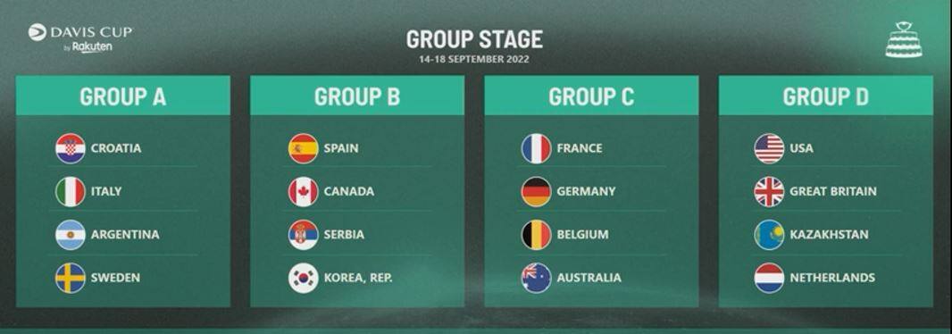 Sorteggiate le avversarie dell'Italia nella fase a gironi della Coppa Davis. Gli azzurri di Filippo Volandri affronteranno a Bologna la Croazia finalista del 2021, l'Argentina di Schwartzman e la Svezia. Appuntamento dal 14 al 18 settembre, con l'obiettivo di qualificarsi per le fasi finali in programma a Malaga due mesi più tardi
