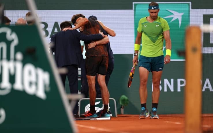 Non con una affettuosa stretta di mano a rete, ma con Alexander Zverev che, in stampelle e con la caviglia talmente gonfia da non poter neanche mettere la scarpa, riceve l’ovazione di un Philippe Chatrier che non ha parole o applausi sufficienti per togliergli un peso dal cuore. E' finita così la prima semifinale dell'ezdizione 2022 del Roland Garros. E neanche Rafa Nadal, che ha raggiunto la quattordicesima finale parigina in carriera nel giorno in cui ha compiuto 36 anni e che domenica giocherà per mettere il ventiduesimo Major in bacheca, sa bene cosa dire o come sentirsi, perché nessuno mai vuole vincere una semifinale in uno Slam così, non per meriti, ma per un destino straziante, cattivo e crudele. Soprattutto crudele.