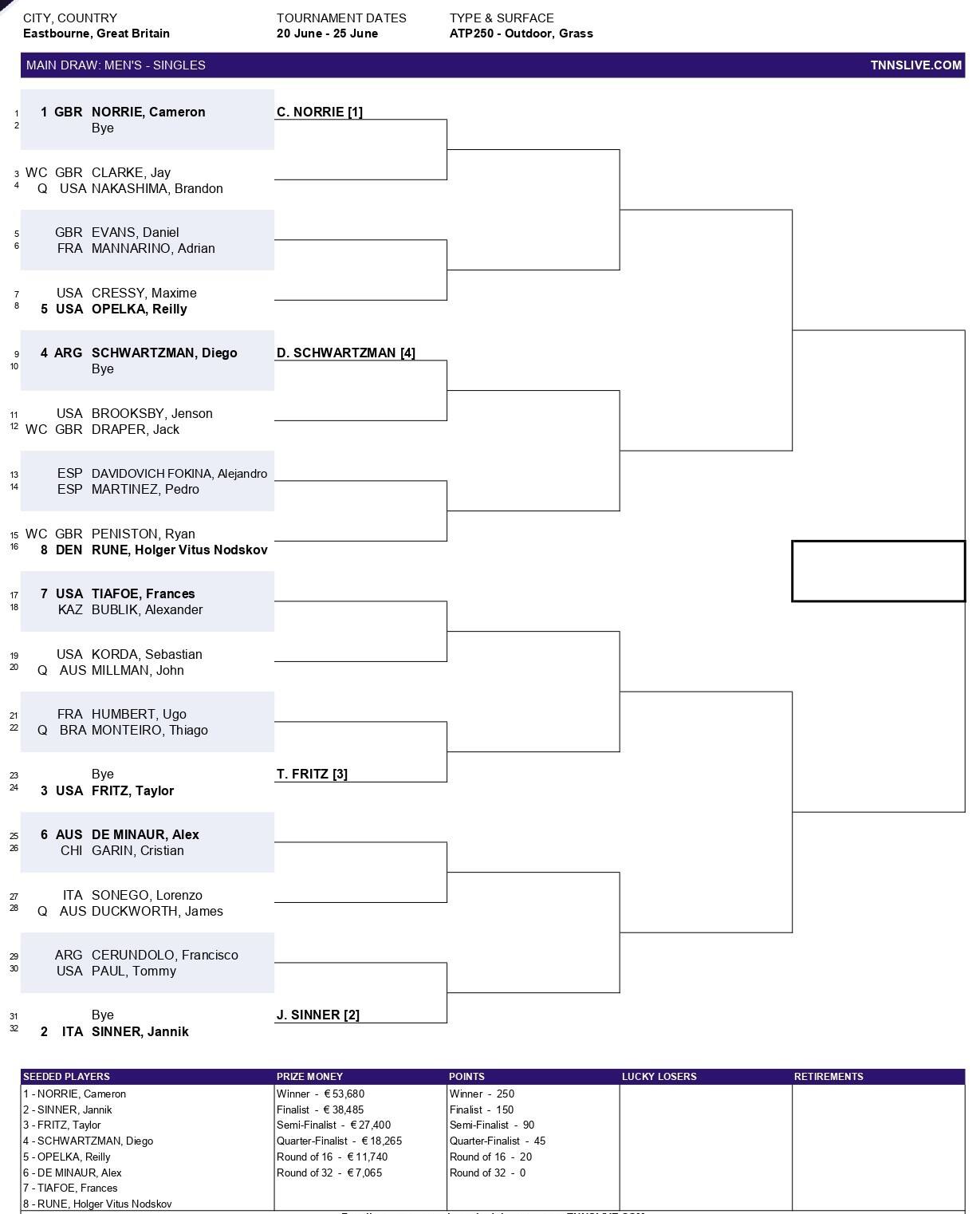 Sono due gli italiani nel main draw di Eastbourne. I riflettori saranno puntati su Jannik Sinner, testa di serie numero 2 del torneo, al rientro in gara dopo l'infortunio rimediato al Roland Garros. L'appuntamento segnerà l'ingresso del super coach Darren Cahill nel team dell'altoatesino, una nuova figura per alzare ancor di più l'asticella. Sinner debutterà al secondo turno contro il vincente del match tra Cerundolo e Paul. In tabellone anche Lorenzo Sonego, al terzo torneo stagionale su erba dopo Stoccarda e il Queen's. Il torinese esordirà contro l'australiano James Duckworth, proveniente dalle qualificazioni.