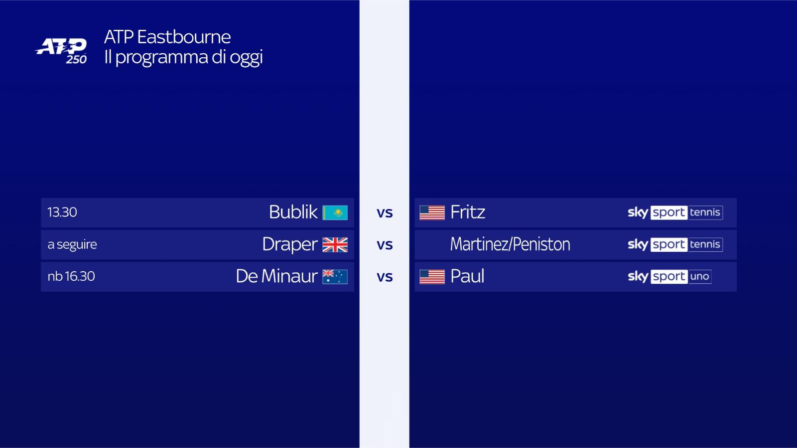 Il programma di oggi dell'ATP Eastbourne su Sky Sport