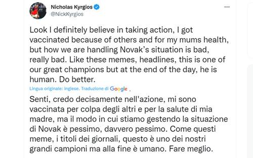 - Il rapporto tra Djokovic e Kyrgios non è sempre stato idilliaco. «Non direte più che sono stupido. Questo è quello che accade quando non si rispettano i protocolli», scrisse su Twitter l’australiano a giugno 2020 dopo il caos Adria Tour, ossia l’esibizione senza distanziamento e mascherine organizzata da Nole in piena emergenza coronavirus e che era culminata con la positività del serbo. «Non ha dimostrato leadership e umiltà», ha aggiunto Nick ad agosto nello stesso anno.