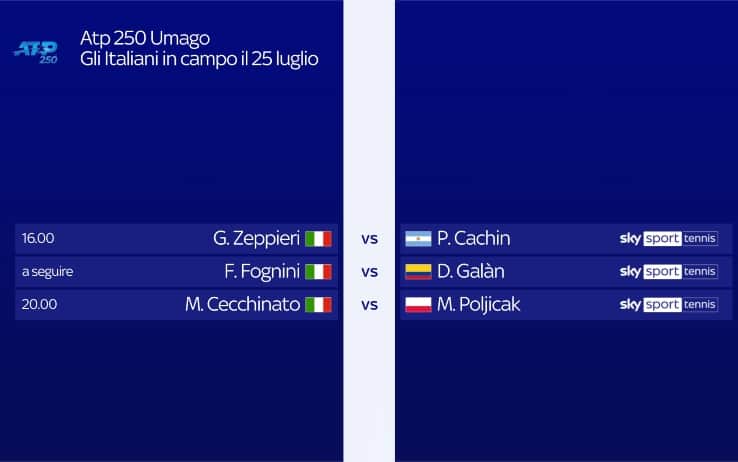 Subito tre italiani in campo nella giornata di lunedì 25 luglio. Apre le danze Giulio Zeppieri, opposto all'argentino Cachin a partire dalle 16. A seguire Fabio Fognini contro Galàn. Infine Marco Cecchinato, che non prima delle 20 sfida il polacco Poljicak. Tutte le sfide sono in diretta su Sky Sport Uno e Sky Sport Tennis.
