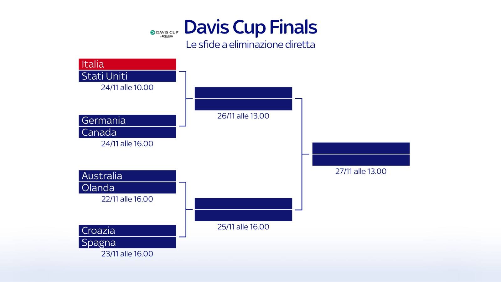 Si alza il sipario sulle finali di Coppa Davis. Da oggi fino a domenica i riflettori saranno puntati su Malaga dove andrà in scena la Final 8 con l'Italia tra le protagoniste attese. Gli azzurri, senza Sinner e Berrettini, scenderanno in campo giovedì alle 10 contro gli Stati Uniti di Fritz e Tiafoe. In caso di passaggio del turno, l'Italia affronterebbe in semifinale o la Germania o il Canada. Il programma, però, si aprirà oggi con Australia-Olanda. Tutte le sfide sono in diretta su Sky sport e in streaming su NOW.