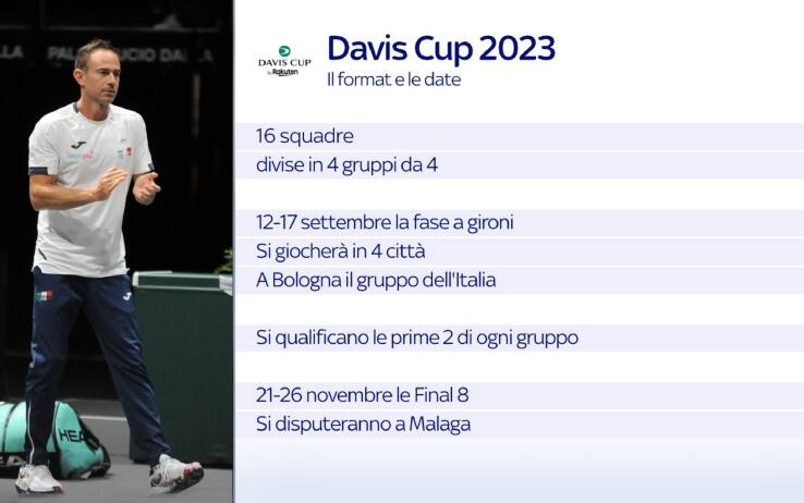 Il Canada, campione in carica, Svezia e Cile saranno le avversarie dell’Italia, inserita nel Girone A delle Davis Cup Finals 2023. Gli azzurri guidati da capitan Filippo Volandri saranno impegnati all’Unipol Arena di Bologna dal 12 al 17 settembre. Il sorteggio della fase a gironi si è svolto a Malaga, sede della fase finale dell’evento ad eliminazione diretta con quarti, semifinali e finale dal 21 al 26 novembre.