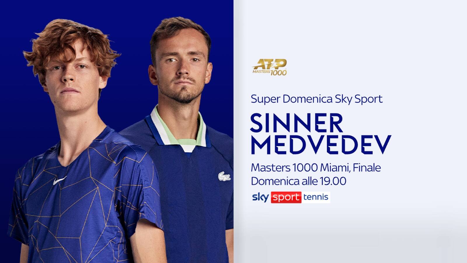 L'incontro tra Jannik Sinner e Daniil Medvedev, valido per la finale del Miami Open, si giocherà domenica 2 aprile alle ore 19 italiane, all'Hard Rock Stadium di Miami. L'incontro sarà in diretta su Sky Sport Tennis e in streaming su NOW. Il match andrà in onda anche su Sky Sport Uno al termine del Gran Premio di MotoGP in Argentina. Telecronaca di Elena Pero, commento di Paolo Bertolucci. Su Sky Sport Tennis, a partire dalle 8.15, ci sarà una programmazione interamente dedicata a Jannik Sinner con le repliche dei match giocati dall'azzurro a Miami, dal 2° turno alla semifinale.