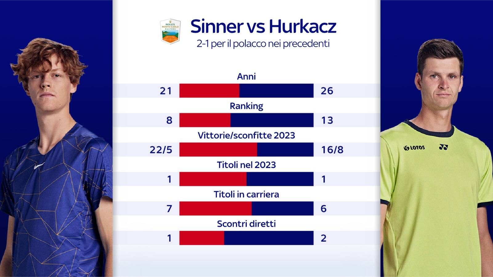 Tempo di ottavi di finale al Masters di Monte-Carlo, terzo 1000 della stagione. Italiani ancora protagonisti dei match di cartello in programma oggi. Lorenzo Musetti, 16^ testa di serie del seeding, sfida il n°1 del mondo, Novak Djokovic. Sono tre i precedenti, tutti vinti dal serbo, che però ricorda molto bene il primo confronto al Roland Garros, quando si trovò costretto a rimontare due set di svantaggio al carrarino. Jannik Sinner, settima testa di serie del torneo, sfida l'amico Hubert Hurkacz (10): sono tre i precedenti, con il polacco avanti 2-1. A chiudere il programma del giorno, invece, sarà Matteo Berrettini che affronterà Holger Rune, n. 6 del seeding. Sarà il remake della sfida giocata poche settimane fa ad Acapulco, conclusa con il ritiro del romano sul 6-0 1-0 in favore del danese. Il torneo è in diretta su Sky Sport Uno, Sky Sport Tennis e in streaming su NOW.