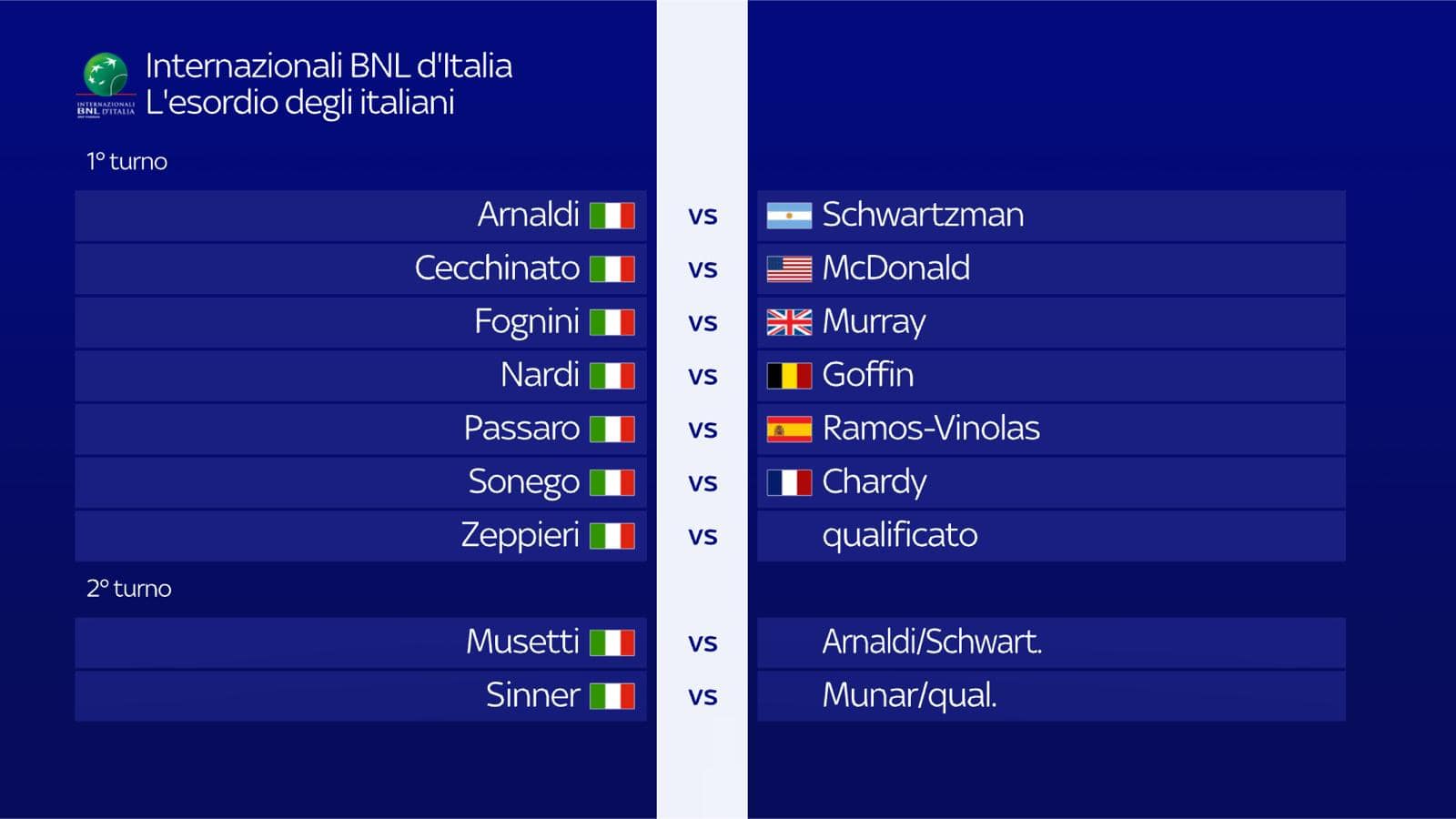 Con il sorteggio a Piazza di Spagna è iniziato il conto alla rovescia per il via degli Internazionali d'Italia, da seguire in diretta su Sky Sport e in streaming su NOW dal 10 al 21 maggio. Nove gli italiani già certi di un posto in main draw, capitanati da Jannik Sinner: l'altoatesino, n. 8 al mondo, è stato sorteggiato nella parte alta del tabellone. Per lui possibile quarto di finale con Casper Ruud e un'eventuale semifinale con Nole Djokovic, al rientro dopo il forfait di Madrid. Sinner entrerà in gara al secondo turno così come Lorenzo Musetti, inserito nel quarto di Stefanos Tsitsipas che al terzo turno potrebbe affrontare Sonego. Per il carrarino possibile esordio contro Arnaldi che al 1° turno sfiderà Diego Schwartzman. La sfida più attesa, però, sarà quella tra Fabio Fognini e Andy Murray, remake del match che nel 2017 infiammò il centrale del Foro Italico con la vittoria del ligure in due set sull'allora numero uno al mondo.