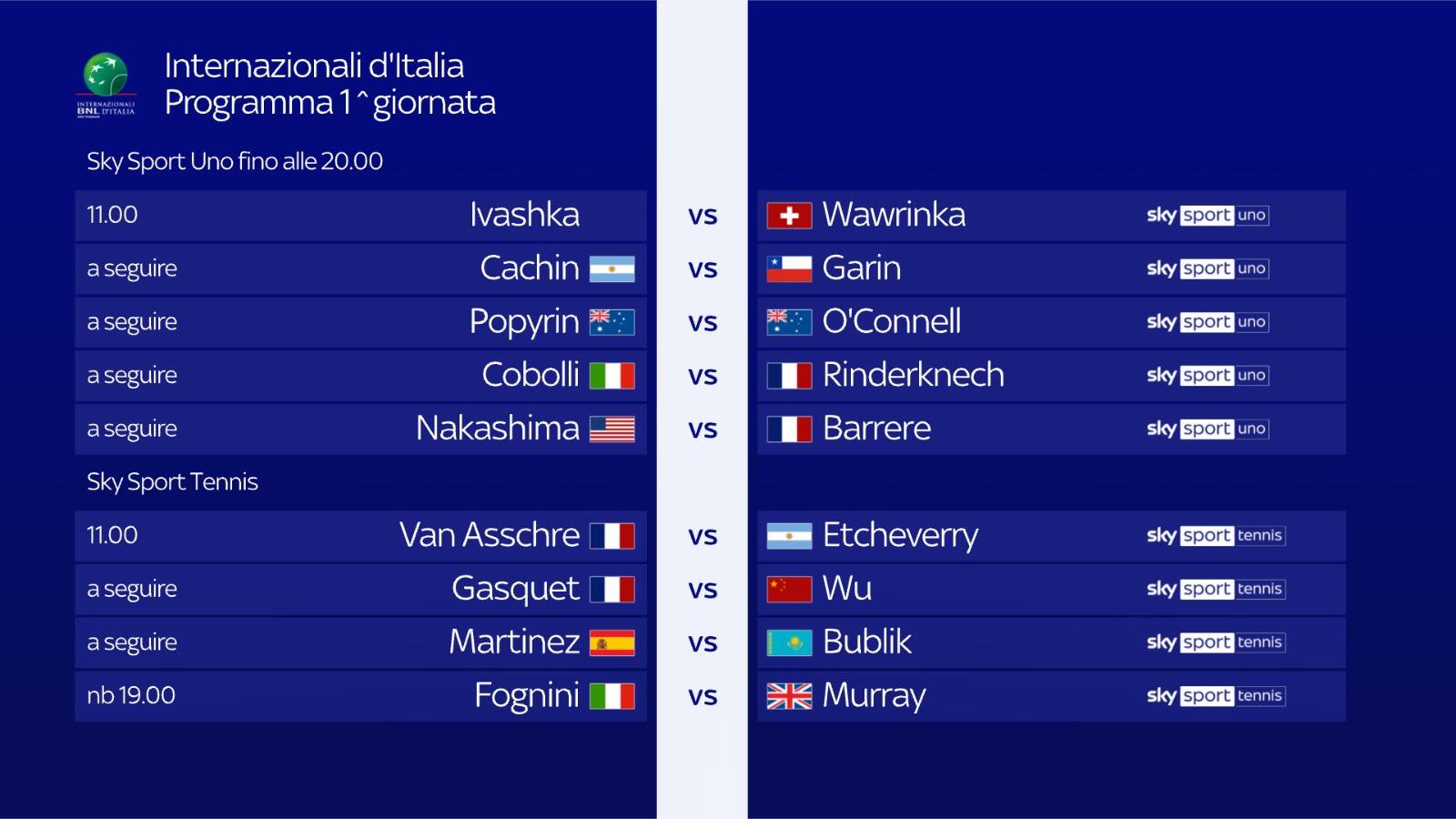 masters romaAl via oggi l'80esima edizione degli Internazionali d'Italia di tennis. Oltre 160 ore di diretta su Sky, Official Broadcaster del torneo maschile, sino alla finale del 21 maggio. Si parte subito forte, con Fognini-Murray e Cobolli-Rinderknech, in attesa dell'esordio di Sinner al 2° turno. Il torneo è live su Sky Sport Uno, Sky Sport Tennis e anche in streaming su NOW