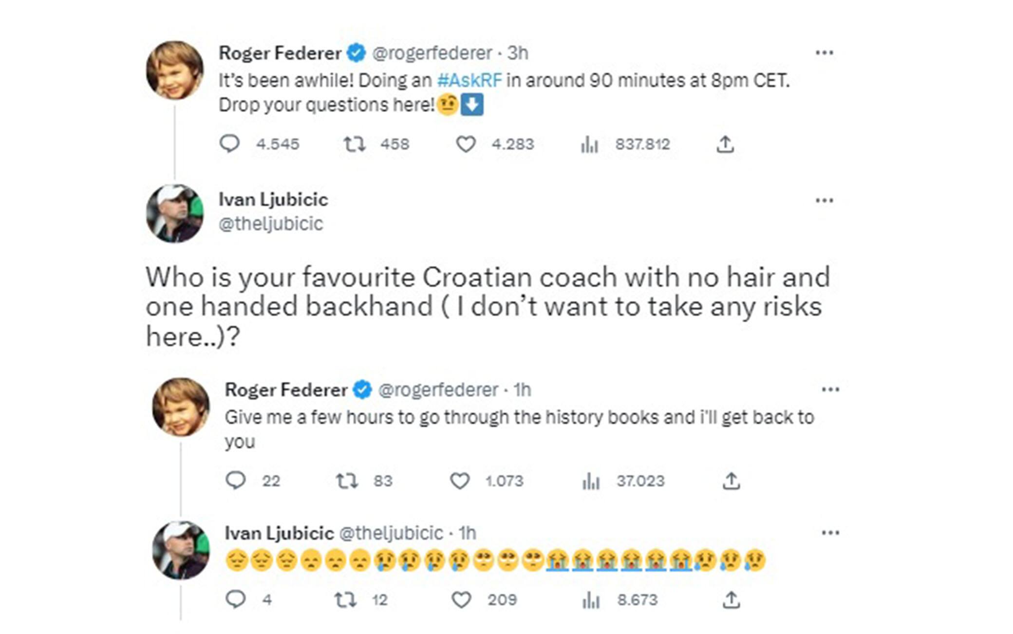 LO 'SCAMBIO'Irresistibile 'scambio' a colpi di tweet tra l'ex campione svizzero e il suo ultimo coach. Alludendo a se stesso, Ljubicic si era inserito tra le domande da rivolgere a 'King Roger': "Chi è il tuo allenatore croato preferito senza capelli e con il rovescio a una mano (non voglio correre rischi qui...)?". Divertente la risposta di Federer: "Dammi qualche ora per sfogliare i libri di storia e ti dirò"