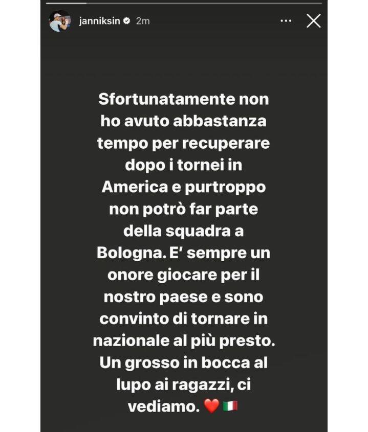 Intanto, sui social, è arrivato il messaggio di conferma della sua assenza a firma dello stesso Sinner: "Sfortunatamente non ho avuto abbastanza tempo per recuperare dopo i tornei in America e purtroppo non potrò far parte della squadra a Bologna - ha scritto su Instagram -. E' sempre un onore giocare per il nostro paese e sono convinto di tornare in nazionale al più presto. Un grosso in bocca al lupo ai ragazzi, ci vediamo".