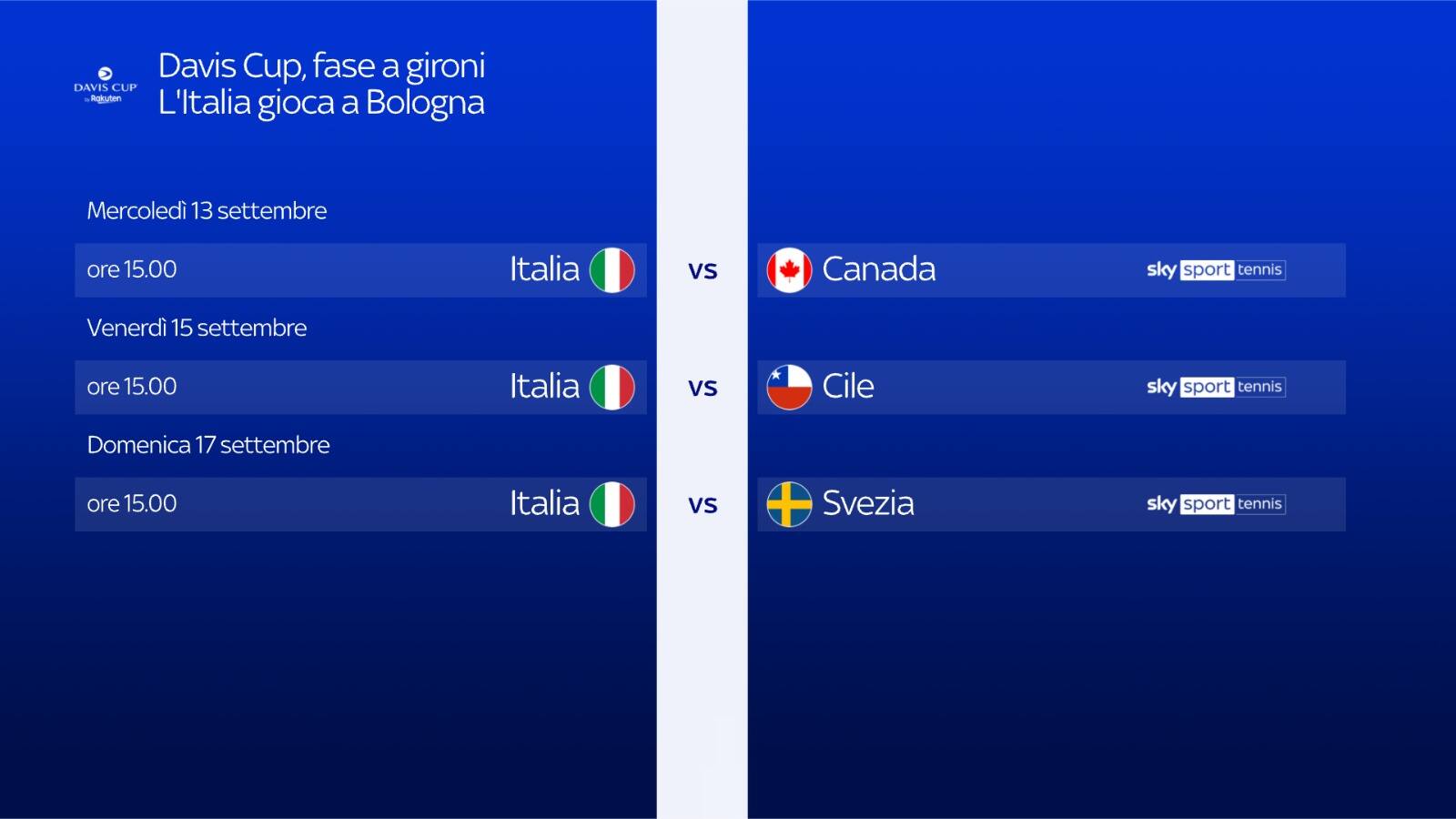 L'Italia di Coppa Davis riparte dalla Unipol Arena di Bologna. Oggi alle 15 contro il Canada gli azzurri debuttano nel Gruppo A delle Finals, che comprende anche Cile e Svezia: obiettivo arrivare tra le prime due e centrare così la qualificazione per la Final 8, dai quarti alla finale, a Malaga a novembre. Si gioca con girone all'italiana e la formula dei due singolari (n°1 vs n°1 e n°2 vs n°2) e del doppio. Tutti i match sono in diretta su Sky Sport e in streaming su NOW.