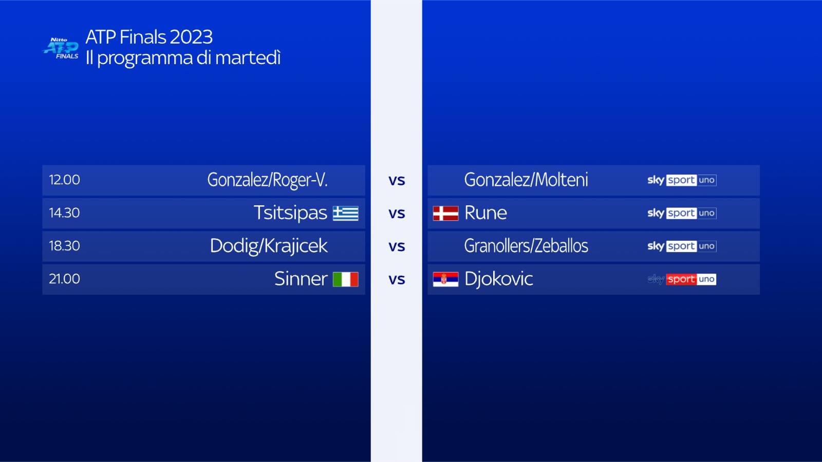 - ore 12: 1° doppio su Sky Sport Tennis e NOW;