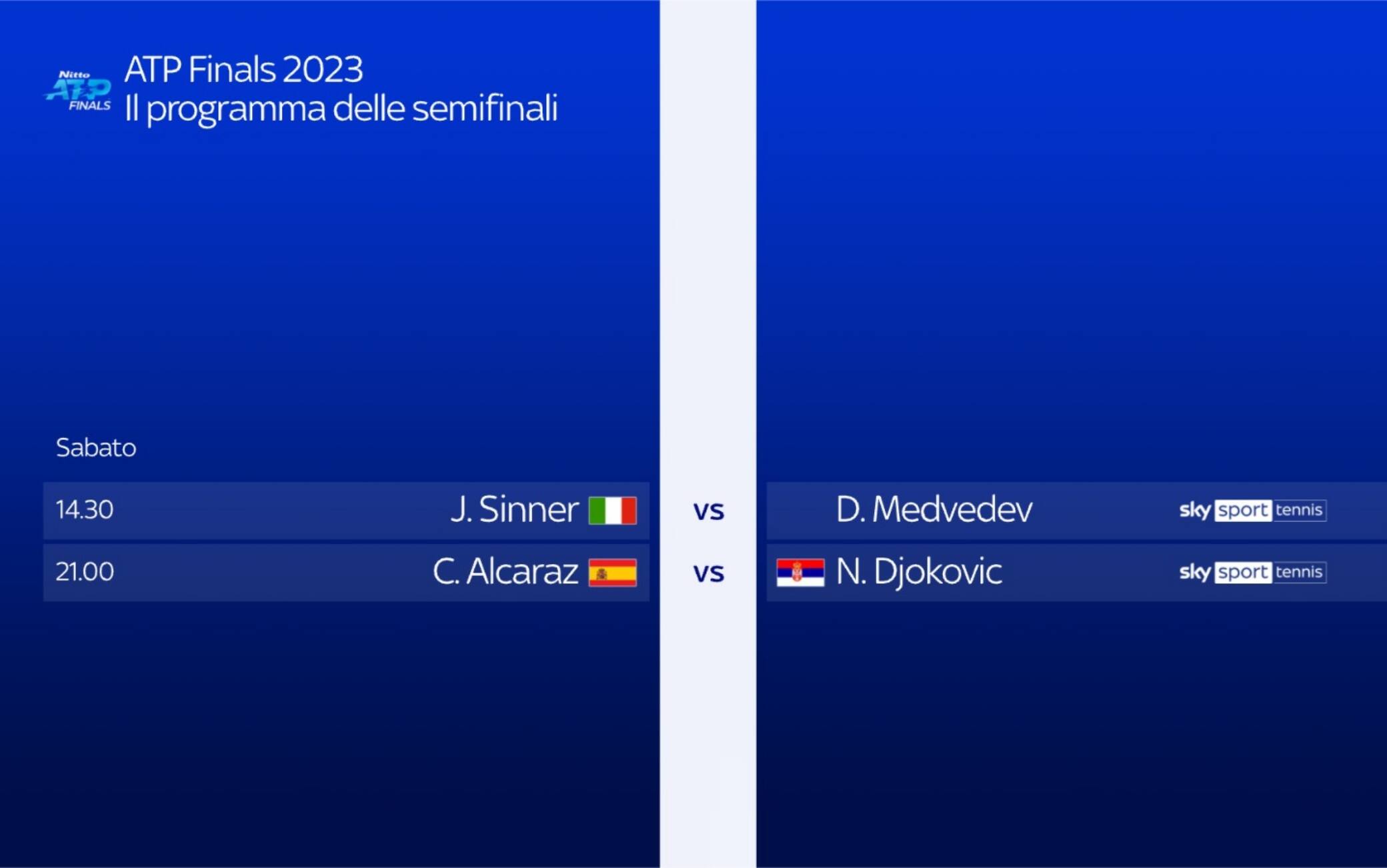 L'incontro tra Jannik Sinner e Daniil Medvedev, valido per le semifinali delle ATP Finals 2023, è in programma sabato 18 novembre, ore 14.30, al Pala Alpitour di Torino. L'incontro sarà in diretta su Sky Sport Uno, Sky Sport Tennis e in streaming su NOW con telecronaca di Elena Pero e commento tecnico di Paolo Bertolucci.