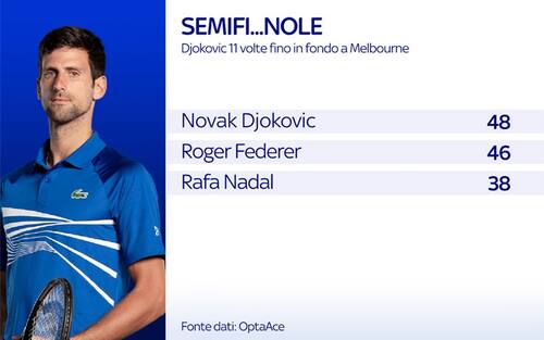 - L'ennesimo record è quello delle semifinali a livello Slam: con quella di Melbourne, siamo a quota 48. Staccato Roger Federer a 46, più dietro Nadal, Connors e Lendl. Il tutto in 73 Slam giocati in carriera