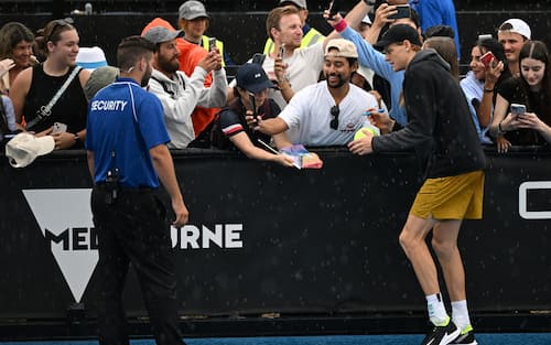 - Nonostante la pioggia, al termine dell'allenamento Sinner si è intrattenuto con i tifosi che hanno riempito le tribune del campo 10 per foto e autografi