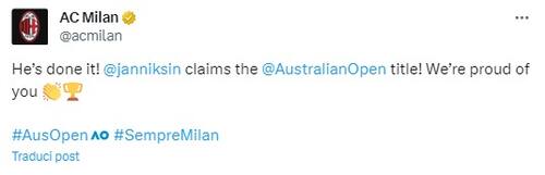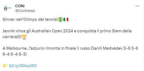 - "Il primo Slam, Sinner vince gli Australian Open. Congratulazioni Jannik! Fenomeno"