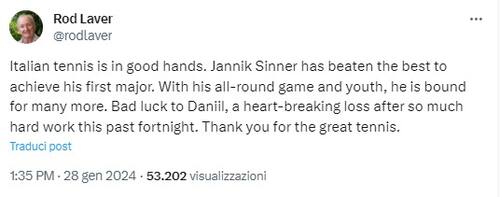 - Tutto il mondo del tennis applaude Sinner. Su tutti spicca Rod Laver a cui è intitolata l'Arena dove ha vinto Jannik: "Il tennis italiano è in buone mani. Jannik Sinner ha battuto i migliori per conquistare il suo primo major. Con il suo gioco a tutto tondo e la sua giovinezza è destinato a vincerne molti altri. Un po' di sfortuna per Medvedev che ha perso in modo straziante dopo due settimane di duro lavoro. Grazie per il grande tennis"