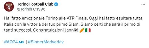 - Hai fatto emozionare Torino alle ATP Finals. Oggi hai fatto esultare tutta Italia con la vittoria del tuo primo Slam. Siamo certi che sarà il primo di tanti successi. Congratulazioni Jannik!