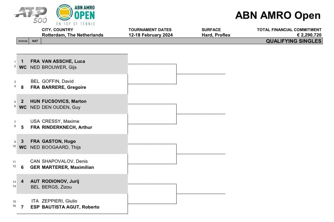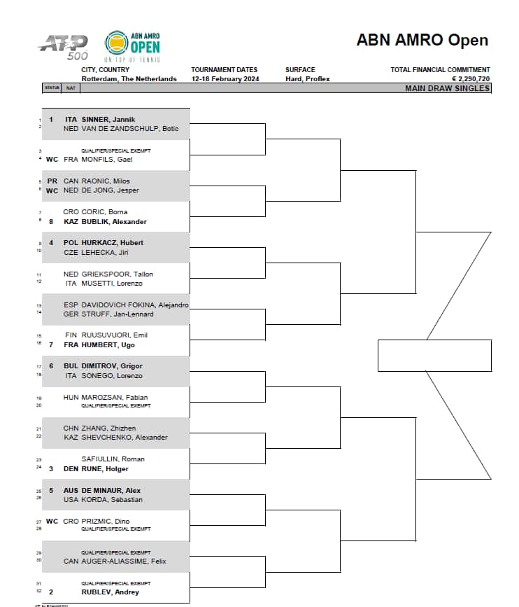 Atp Rotterdam, il tabellone: Sinner debutta con Van de Zandschulp