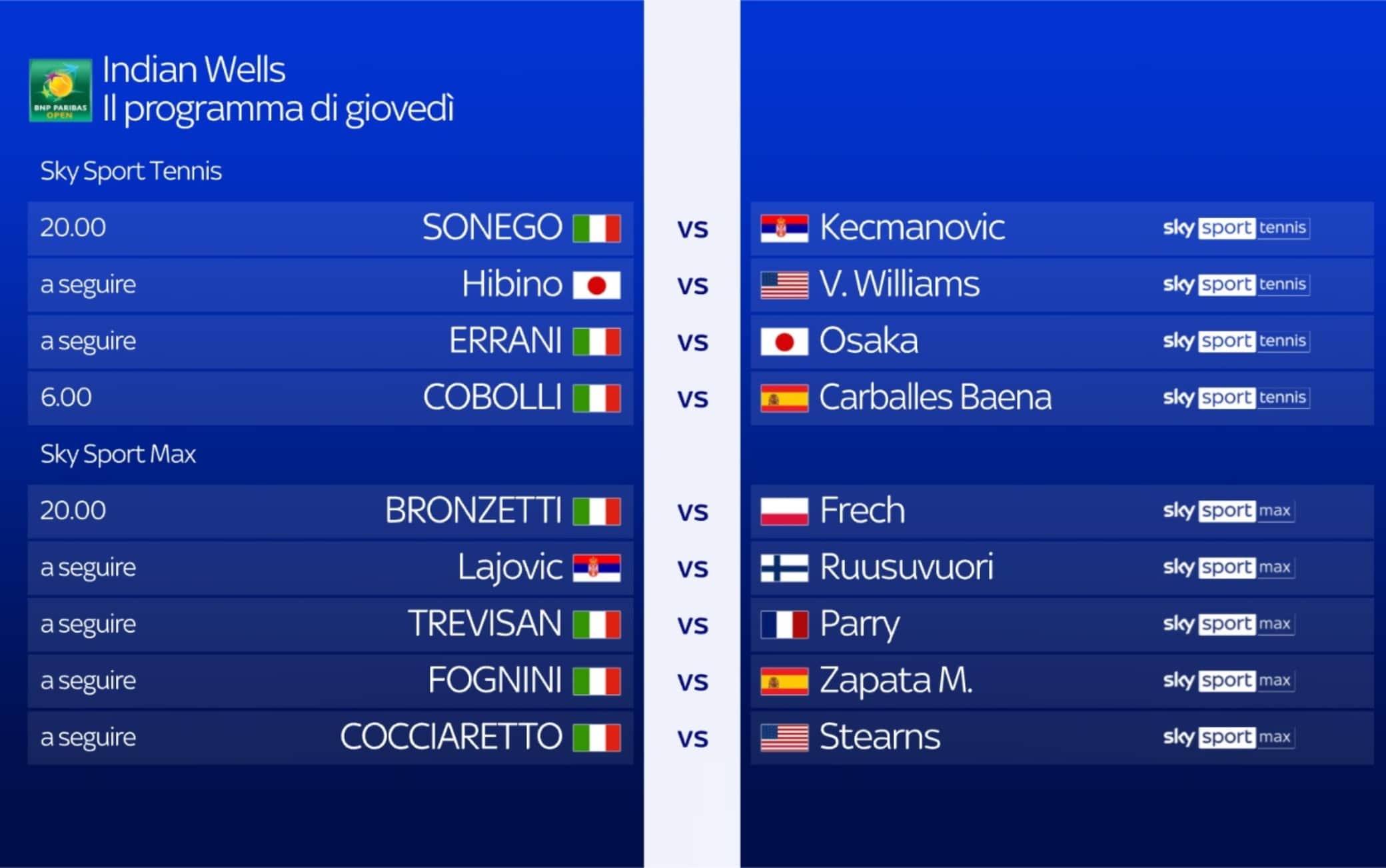 Sarà un giovedì a tinte azzurre al Masters 1000 di Indian Wells, da seguire in diretta su Sky Sport e in streaming su NOW. Una giornata con sette italiani in campo tra il torneo maschile (3) e quello femminile (4). Tra gli uomini riflettori su Lorenzo Sonego. Reduce dal ko contro Medvedev a Dubai e scivolato fuori dalla top 50, il torinese affronta il serbo Miomir Kecmanovic, n. 47 al mondo. Poi sarà doppia sfida Italia-Spagna con Cobolli e Fognini (per Fabio è la 15^ partecipazione al torneo di Indian Wells) opposti a Carballes Baena e Zapata Miralles. Tra le donne, invece, particolare attenzione per il match di Sara Errani, entrata in tabellone dalle qualificazioni, contro Naomi Osaka, rientrata in questa stagione nel circuito dopo un anno e mezzo di stop. Spazio anche a Lucia Bronzetti (contro la polacca Frech), Martina Trevisan (sfiderà la francese Parry) ed Elisabetta Cocciaretto (match contro la statunitense Stearns e all'orizzonte il 2° turno con Aryna Sabalenka).