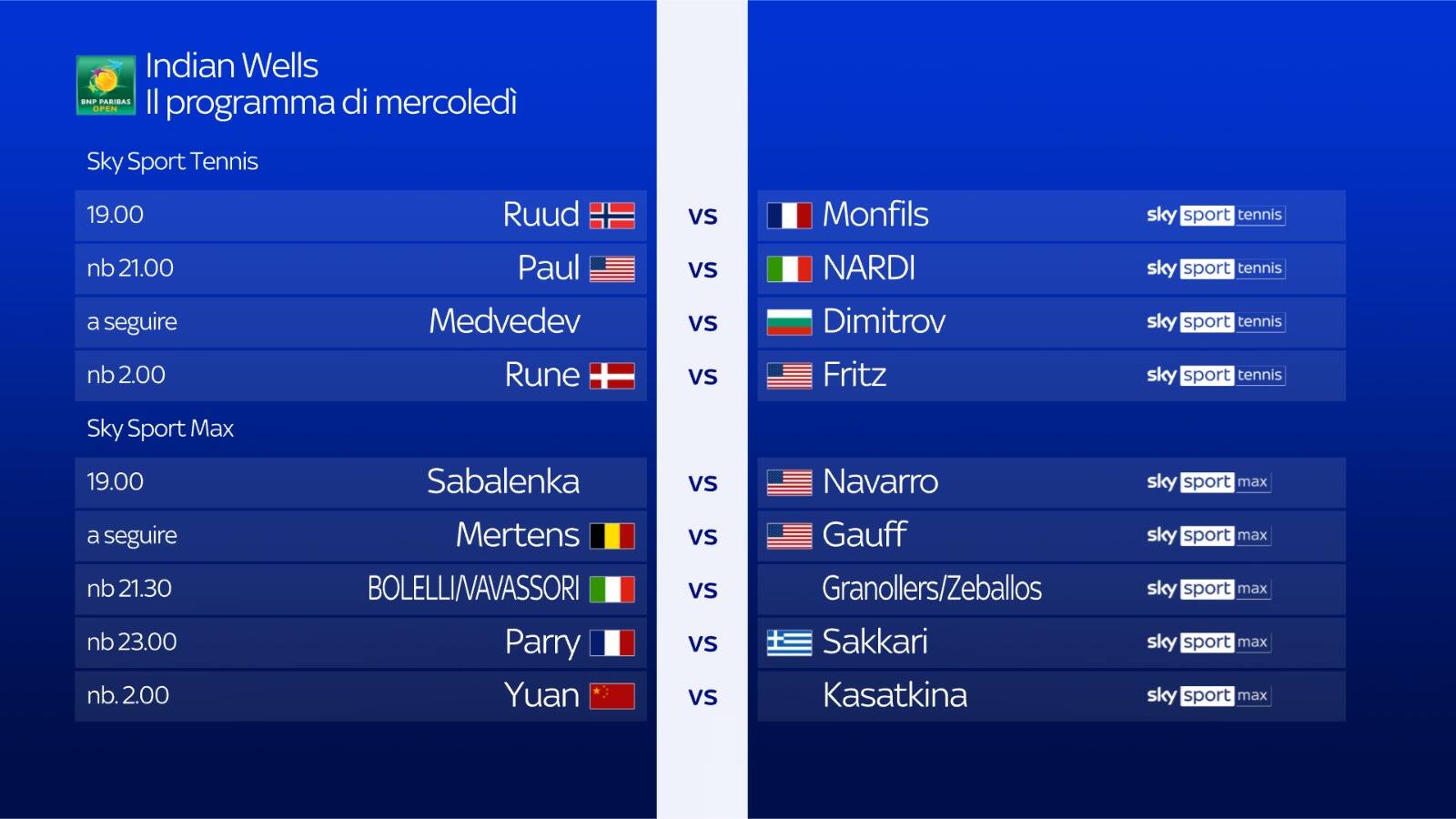 Il match tra Luca Nardi e Tommy Paul, valida per gli ottavi di finale del Masters 1000 di Indian Wells, è in programma mercoledì 13 marzo, secondo dalle 19 nello Stadium 2 dell'Indian Wells Tennis Garden. L'incontro sarà in diretta su Sky Sport Tennis e in streaming su NOW.