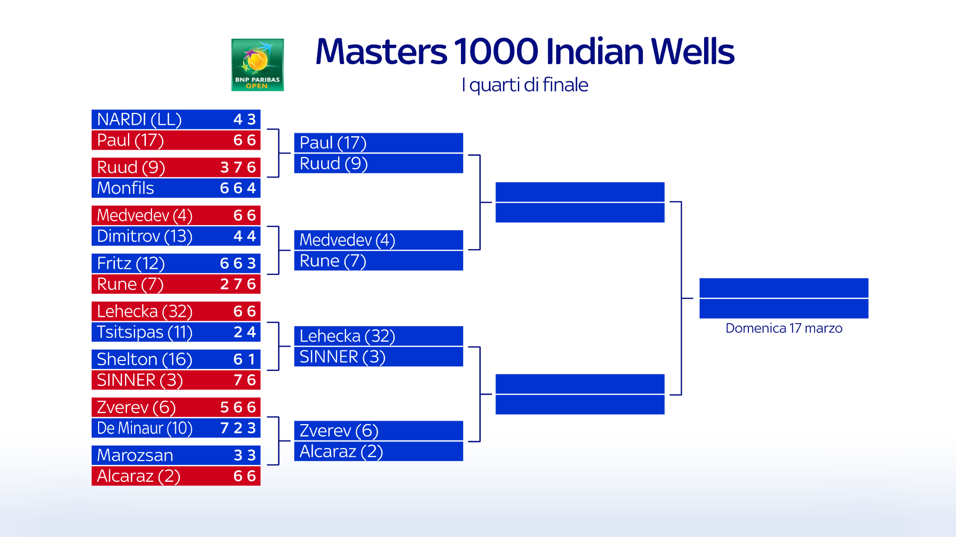 atp indian wellsJannik Sinner va a caccia della seconda semifinale consecutiva a Indian Wells: l'avversario sarà il ceco Jiri Lehecka, n. 32 al mondo, reduce dalle vittorie con Tsitsipas e Rublev. Il match in programma alle ore 19 in diretta su Sky Sport Tennis e in streaming su NOW
