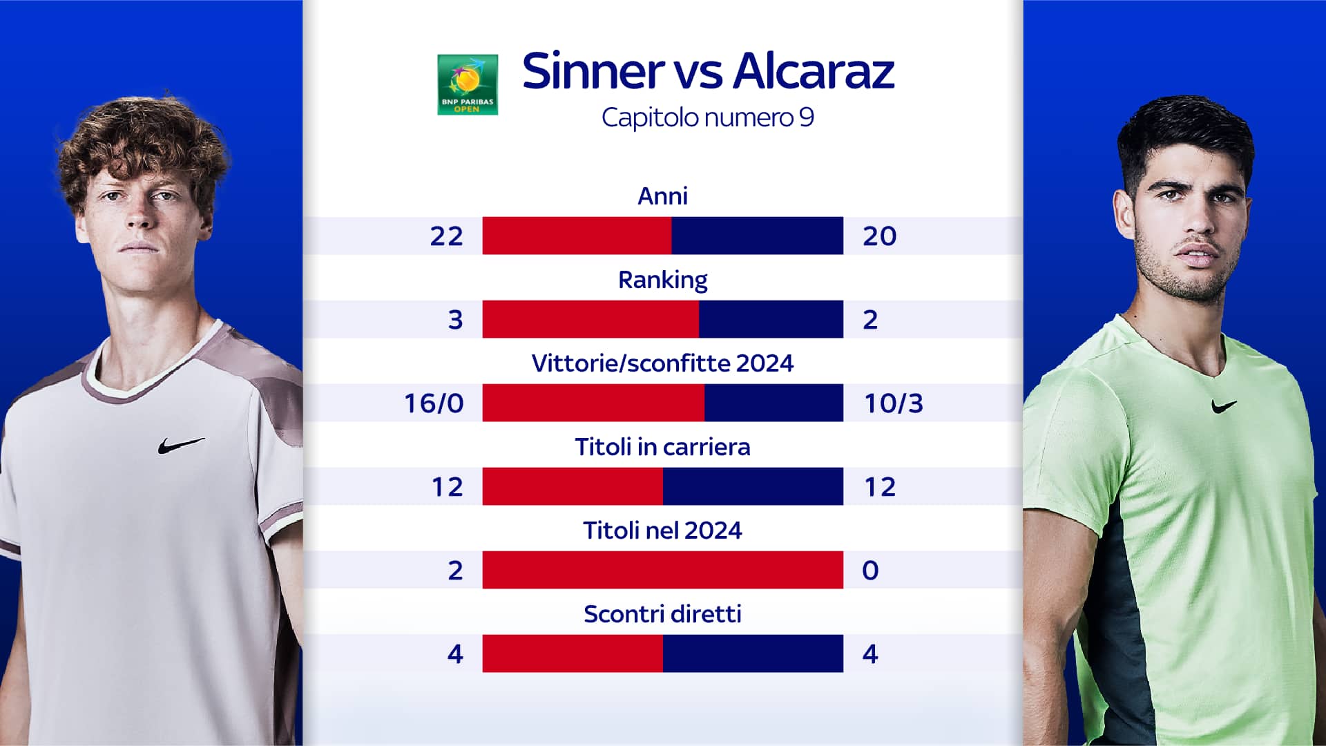 Quella tra Sinner e Alcaraz è una saga agli albori, ma con già otto capitoli in archivio. Una sfida destinata a farci compagnia ancora a lungo. I due scenderanno in campo col bilancio degli head to head in perfetta parità (4-4). Jannik ha vinto gli ultimi due confronti, Carlos non batte l'azzurro proprio da Indian Wells dello scorso anno (anche allora era una semifinale). Di seguito tutti i precedenti:
