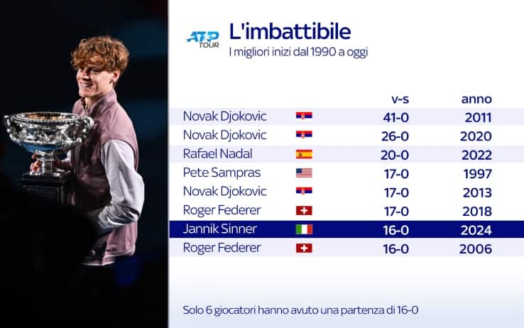Il record assoluto di Novak Djokovic (41 vittorie consecutive a inizio stagione nel 2011, prima del ko al Roland Garros contro uno dei migliori Federer mai visti sulla terra rossa) è ancora lontano. Ma Sinner, ancora imbattuto in questo fantastico 2024 dopo i trionfi all'Australian Open e all'ATP 500 di Rotterdam, ha già messo insieme una delle migliori partenze viste nel circuito dagli anni Novanta ai giorni nostri. L' 'imbattibile' Jannik punta alle 17 di fila di Pete Sampras (1997), Djokovic (2013) e Federer (2018). E se contiamo anche la coda della stagione 2023, ovvero la finale di Coppa Davis contro l'Olanda, Sinner è a quota 19 successi filati. Numeri impressionanti, certificati anche dalle parole dello stesso Alcaraz dopo la vittoria contro Zverev: "In questo momento Jannik è il miglior giocatore del mondo".