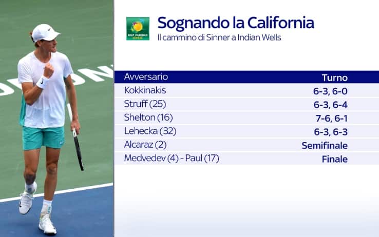 Percorso immacolato fin qui per Jannik Sinner a Indian Wells: l'altoatesino ha superato nell'ordine Kokkinakis, Struff, Shelton e Lehecka senza concedere neanche un set ai suoi avversari. Un solo parziale ceduto, invece, da Carlos Alcaraz, il tie-break perso contro il nostro Matteo Arnaldi all'esordio: poi il classe 2003 si è sbarazzato con facilità di Auger-Aliassime, Marozsan e Zverev, nel match sospeso per l'incredibile invasione di api sul campo centrale dell'impianto californiano.