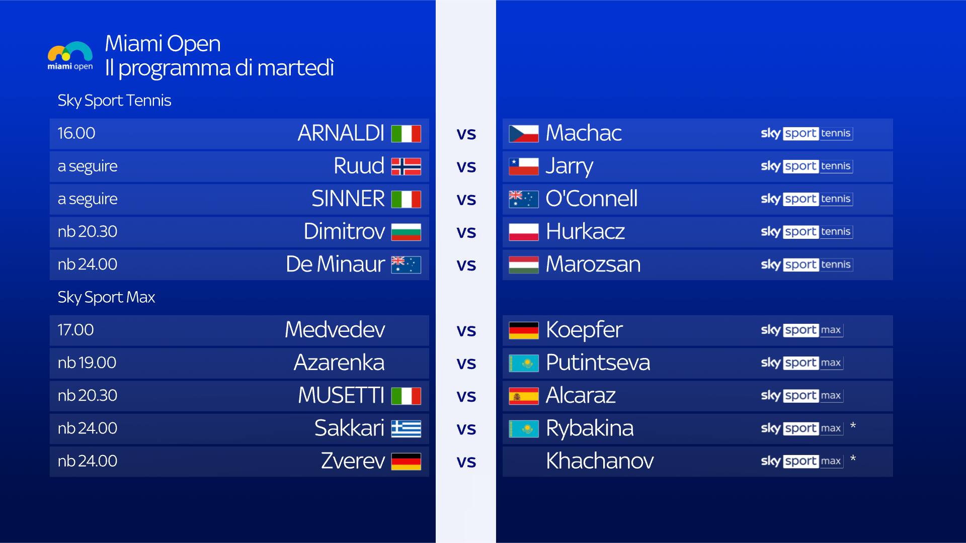 Tutte le partite in programma sui campi di gioco coperti dalle telecamere ATP e WTA saranno visibili grazie alla funzionalità Sky Sport Plus, attraverso il tasto verde del telecomando di Sky Q via satellite o il tasto interattività di Sky Glass, se connessi alla rete internet. Le sfide più interessanti ed emozionanti saranno in diretta su due canali Sky Sport e in streaming su NOW: Sky Sport Tennis sarà il “campo centrale”, affiancato da Sky Sport Max o Sky Sport Uno.