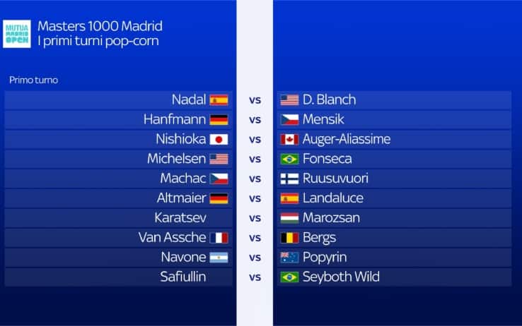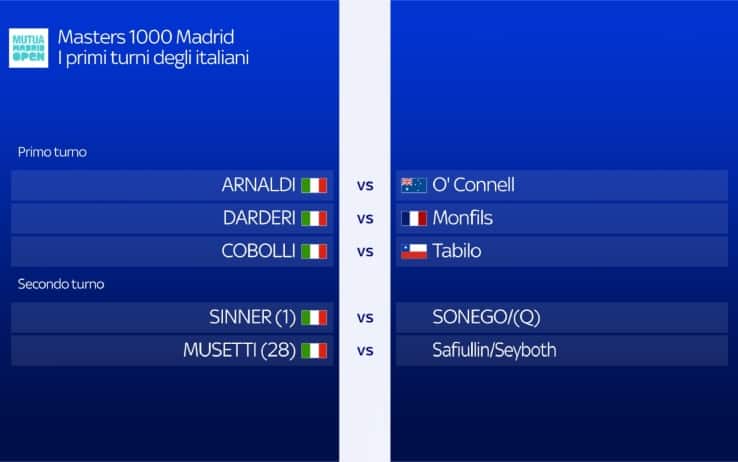 Inizierà contro Lorenzo Sonego o un qualificato il cammino di Jannik Sinner al Masters 1000 di Madrid, in programma dal 24 aprile al 5 maggio, da seguire in diretta su Sky Sport e in streaming su NOW. Testa di serie n. 1 del torneo - primo italiano di sempre a guidare il seeding in un Masters 1000 - Sinner avrà dalla sua parte di tabellone Daniil Medvedev, possibile avversario in semifinale, e Casper Ruud, reduce dal trionfo all'ATP 500 di Barcellona. C'è in tabellone Carlos Alcaraz che debutterà contro Rinderknech o Shevchenko, mentre Rafael Nadal esordirà con il 16enne statunitense Darwin Blanch, al via con una wild card. Oltre a Sinner e Sonego ci sono altri quattro italiani: Musetti attende Seyboth Wild o Safiullin al 2° turno, Arnaldi debutterà con l'australiano O'Connell (poi al 2° turno l'eventuale confronto con Medvedev), Cobolli sfiderà il cileno Tabilo e Darderi se la vedrà con l'esperto Monfils.