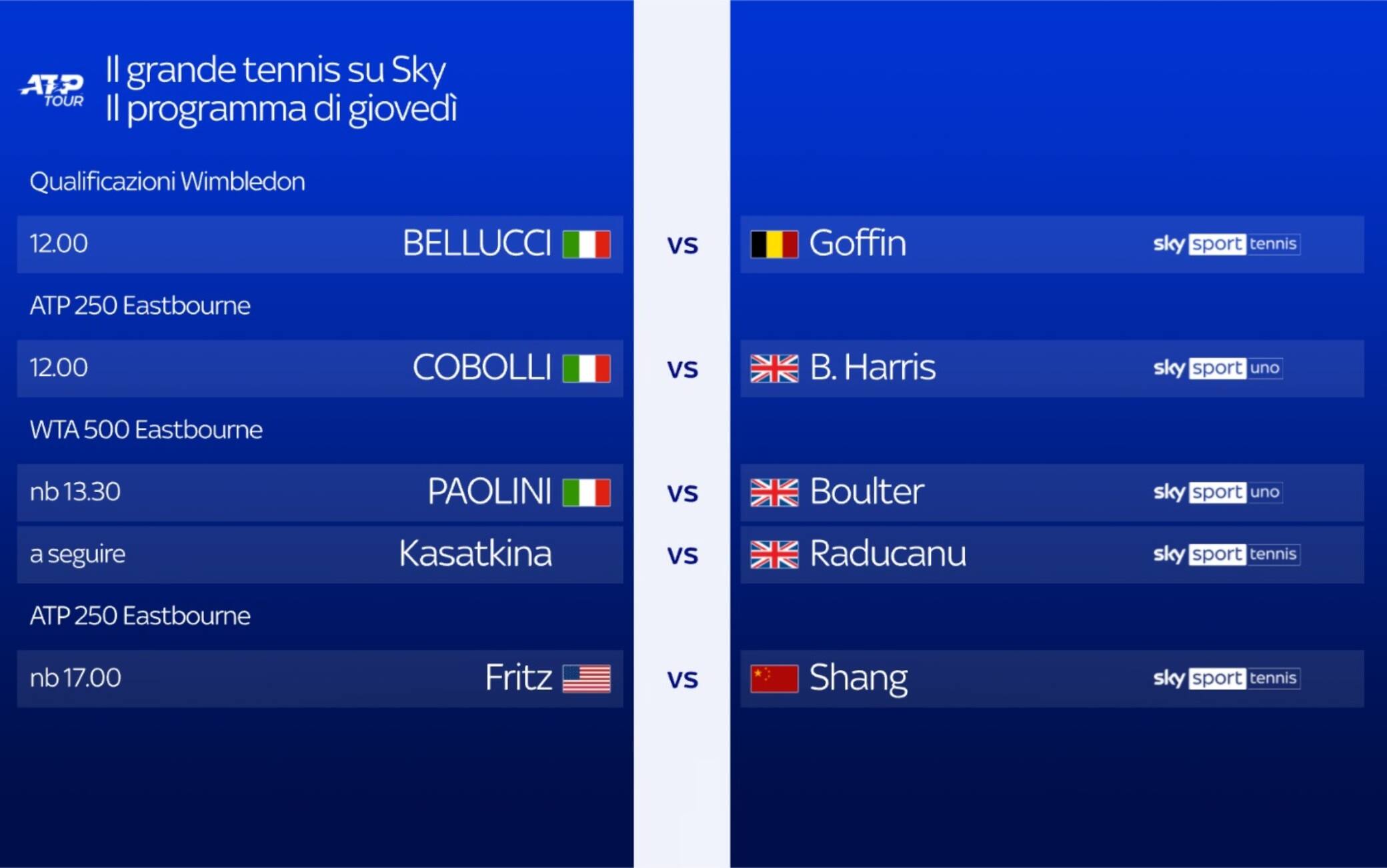 guida tvFlavio Cobolli si gioca un posto in semifinale all'ATP di Eastbourne contro il britannico Harris. Jasmine Paolini affronta nei quarti del torneo WTA Katie Boulter. A Wimbledon Bellucci cerca un posto in tabellone sfidando Goffin. Tutto in diretta su Sky Sport e in streaming su NOW